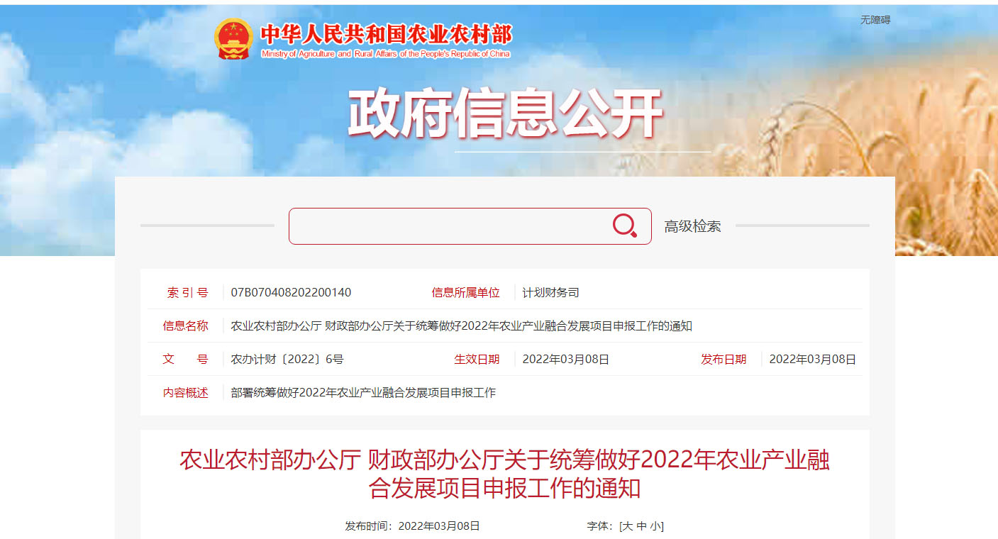 按照《农业农村部办公厅 财政部办公厅关于统筹做好2022年农业产业融合发展项目申报工作的通知》(农办计财〔2022〕6号)要求,农业农村部、财政部组织完成了2022年农业产业融合发