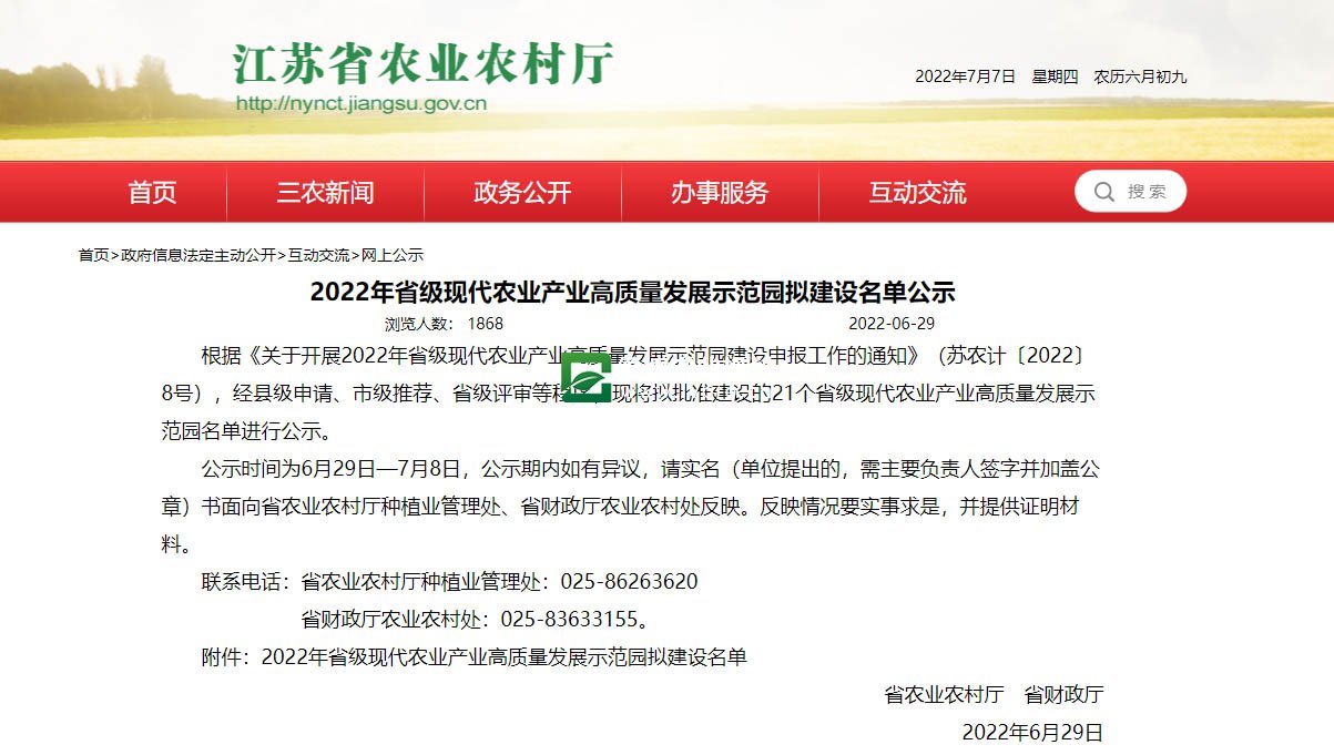据省农业农村厅、省林业局、省发展改革委、省财政厅、省科技厅、省自然资源厅、省生态环境厅、省水利厅联合印发的《江苏省特色农产品优势区建设三年计划》及2022年申报认定工作